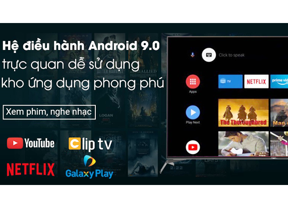 Ứng dụng có sẵn: Kho ứng dụng Google Play Store, YouTube, Netflix, Amazon Video, Primevideo, Spotify