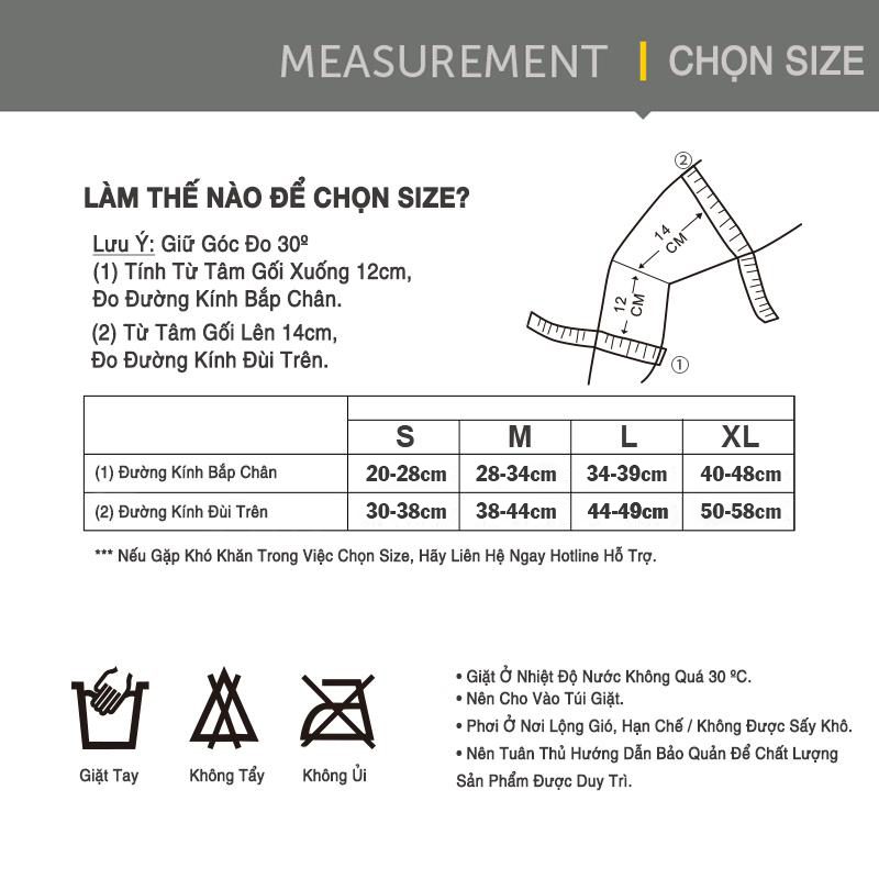 S (30-38cm) / M (38-44cm) / L (44-49cm) / XL (50-58cm) Số đo vòng đùi trên cách đầu gối lên 14cm