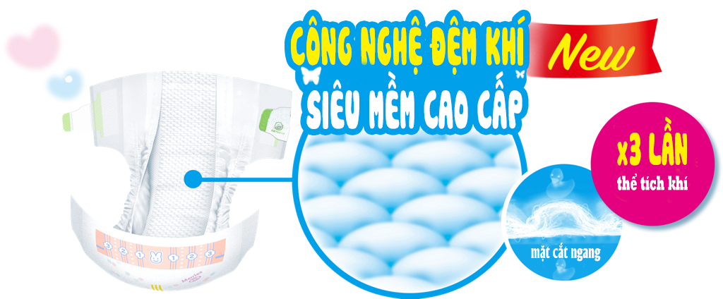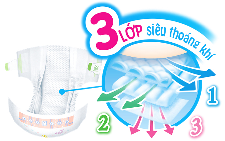 - Thoát khí giữa tã và da bé nhờ bề mặt tiếp xúc điểm xốp mịn;