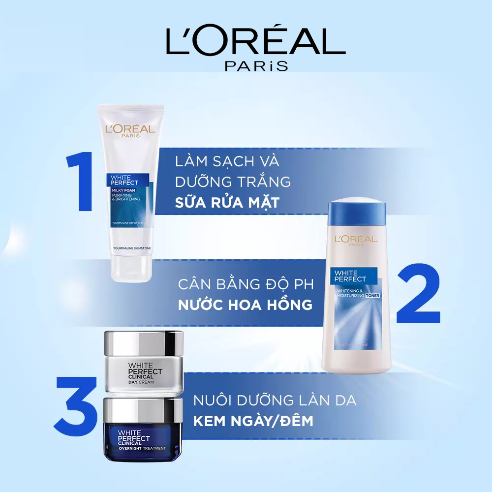 Bộ sản phẩm làm sạch và trắng da L’Oreal thuộc dòng sản phẩm dưỡng trắng White Perfect Clinical, được nghiên cứu bởi viện nghiên cứu L'oreal Paris sẽ là lựa chọn đúng đắn để nuôi dưỡng và chăm sóc làn da trắng sáng mỗi ngày. Với thành phần tinh thể Tourmaline và Vitamin C được nghiên cứu giúp làm dịu và ngăn ngừa hắc tố melanin là nguyên nhân chính gây sạm da, nuôi dưỡng da khỏe mạnh và sáng bóng, sản phẩm là bước khởi đầu hoàn hảo cho quá trình dưỡng da trắng mịn của bạn.