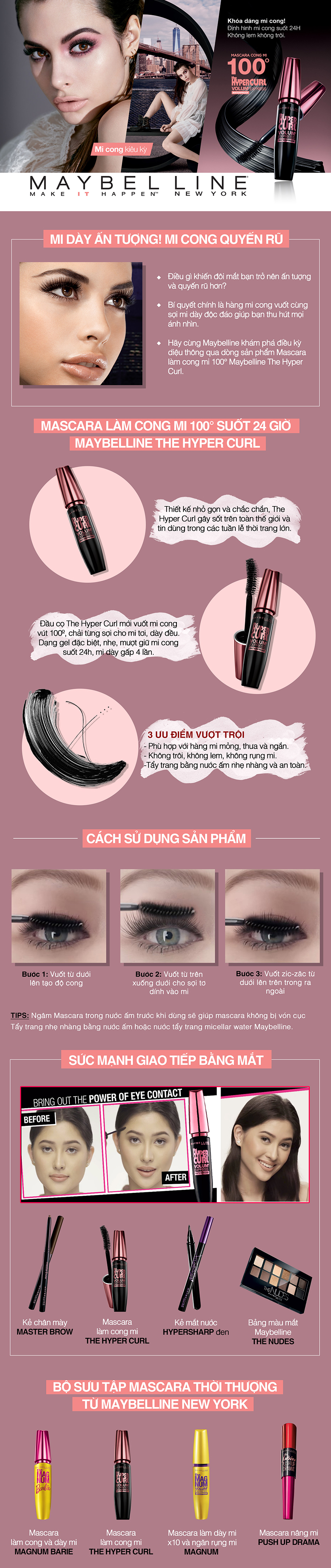 Mascara làm dài và cong mi màu đen huyền thoại của nhà Maybelline New York, Mascara Hyper Curl giúp làm dài mi và giúp hàng mi của bạn cong vút 100° bền đẹp suốt 18 giờ.Mascara Hyper Curl phù hợp với hàng mi mỏng, thưa và không được dài. Hyper Curl sở hữu công thức tối ưu kết hợp với đầu cọ được thiết kế dễ dàng chải tận gốc sợi mi, giúp mascara được bao phủ hiệu quả.