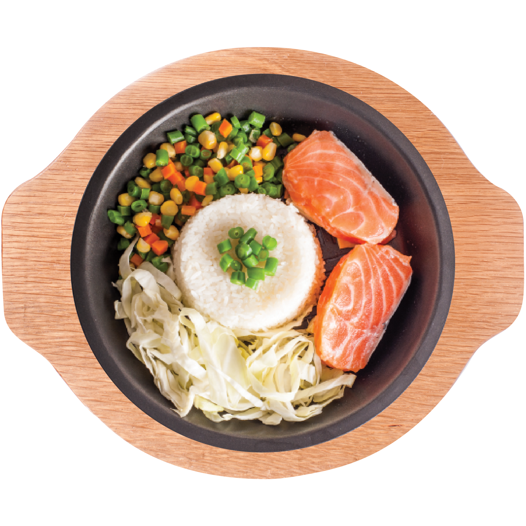 Phần ăn dành cho 1 người, bao gồm cơm, các loại rau củ, cá hồi phi lê dùng kèm với các loại xốt trên menu