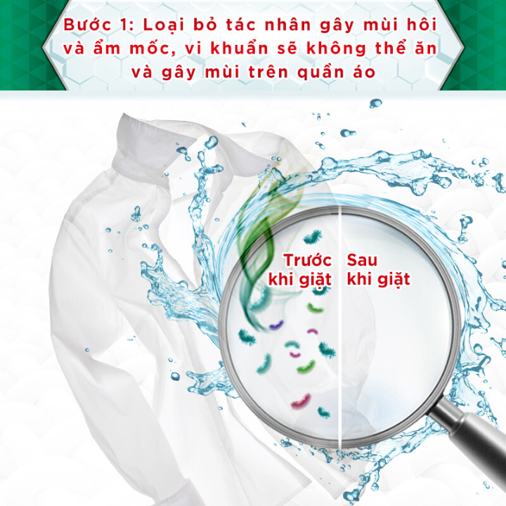 - Loại bỏ các vết bẩn cứng đầu chỉ trong 1 bước và giúp giữ được quần áo trắng sáng, mềm mịn như mới.
