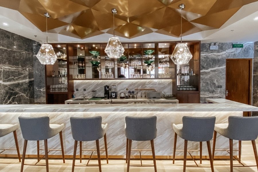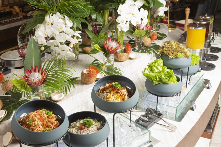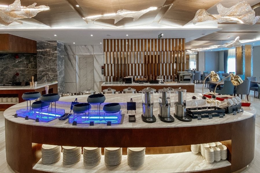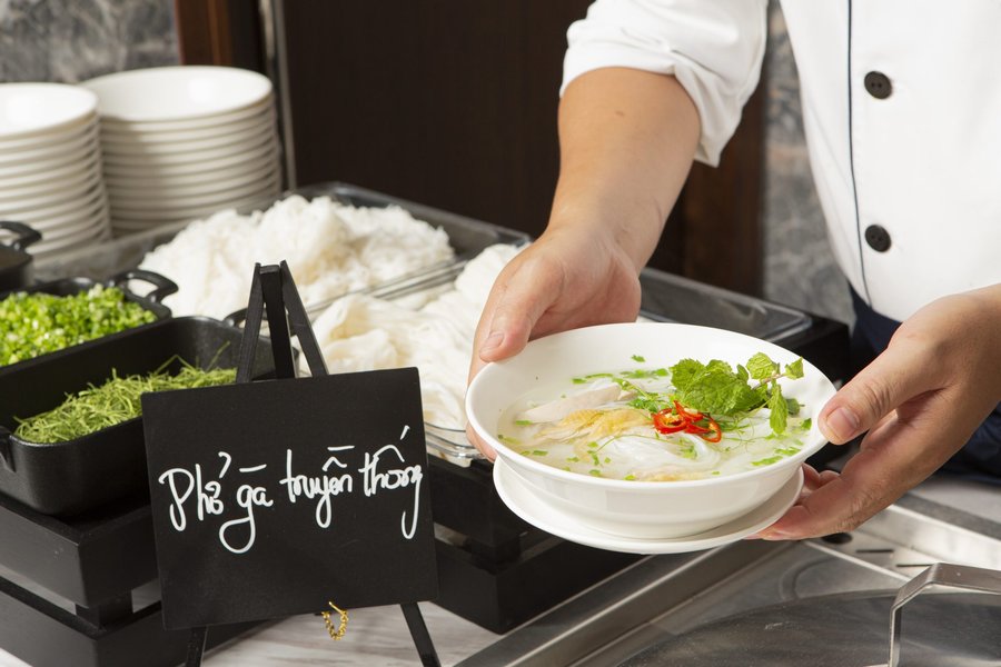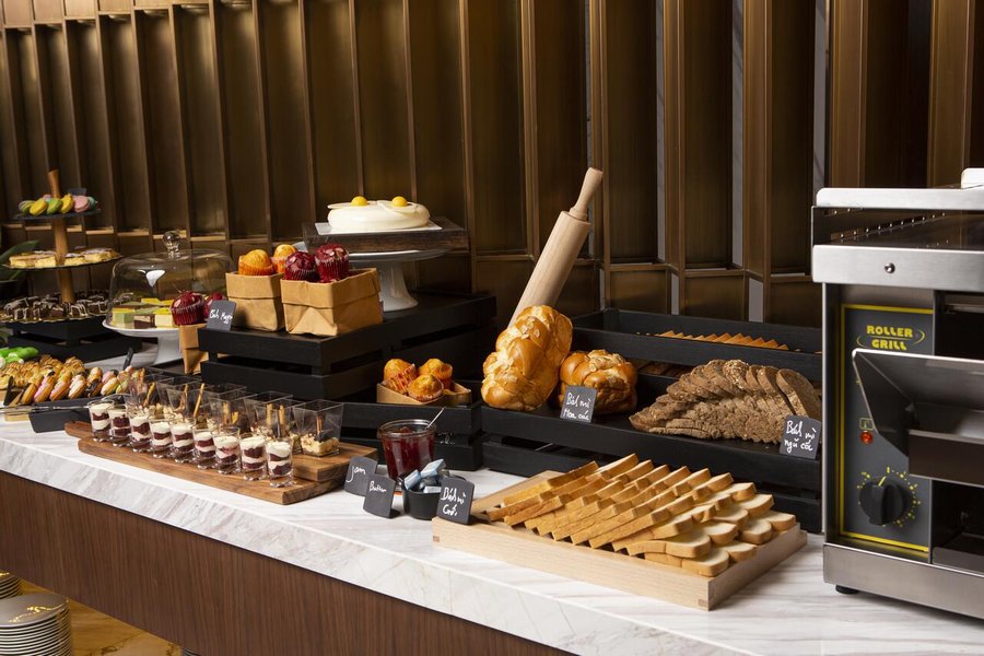 Với quầy buffet và khu vực bếp mở mỗi sáng sẽ đem đến trải nghiệm độc đáo, vừa lạ mà quen khi vừa ăn buffet lại có thể thưởng thức các món ăn sáng truyền thống, nóng hổi của Việt Nam từ những đầu bếp có tay nghề cao và luôn sẵn sàng phục bạn mỗi buổi sáng. Tổng thiết kế chính là sự nổi bật hài hoà giữa phong cách nghệ thuật hiện đại với màu sắc chủ đạo đặc trưng của nhà hàng.
