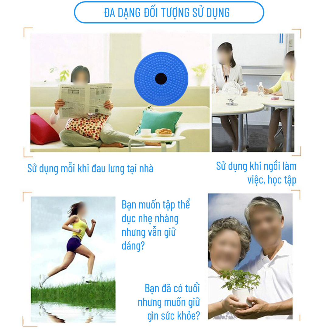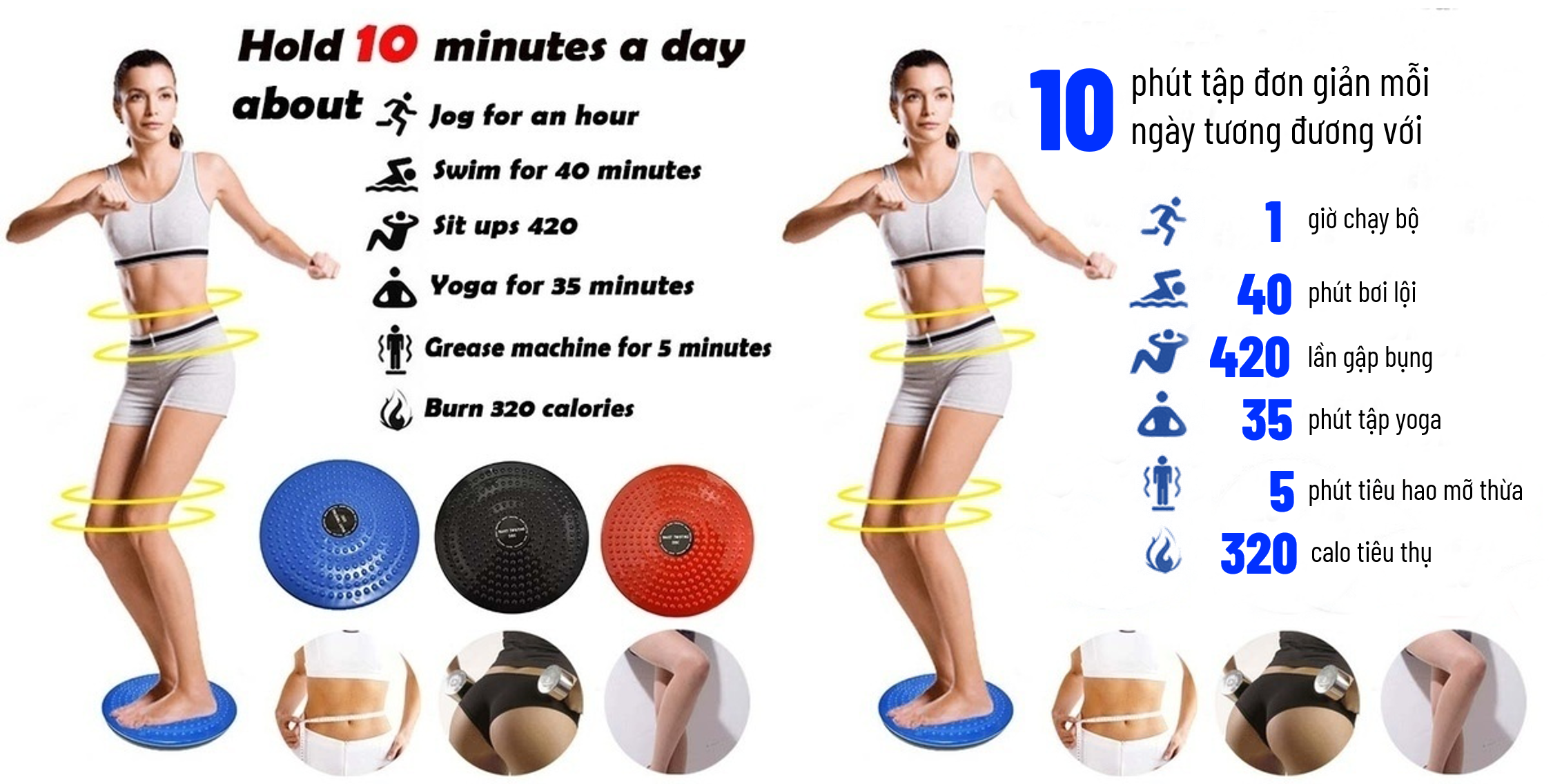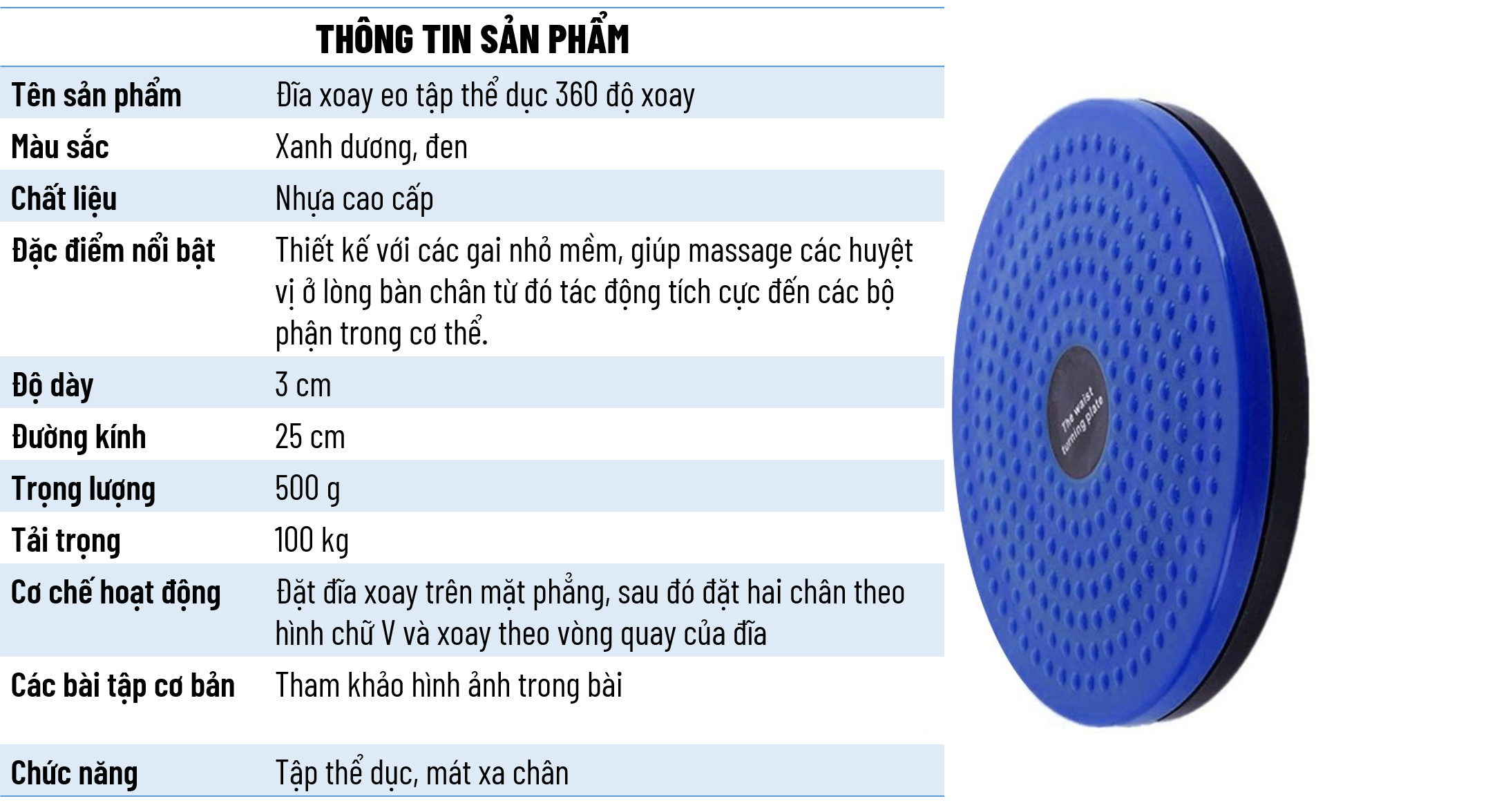 - Sản phẩm giúp người dùng có được cơ thể săn chắc, vòng eo thon gọn với số đo cơ thể hoàn hảo với cơ chế xoay để đánh tan mỡ thừa trong cơ thể. Người dùng chỉ cần đứng lên đĩa rồi xoay người, kết hợp cùng một số động tác khác trong khi tập để tăng cường hiệu quả đạt được