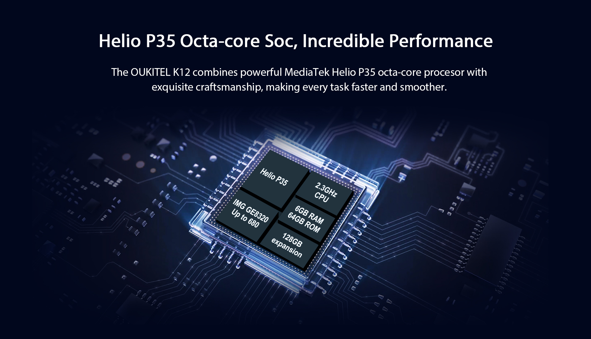 OUKITEL K12 kết hợp bộ vi xử lý lõi tám MediaTek Helio P35 mạnh mẽ với sự khéo léo tinh tế, giúp mọi tác vụ nhanh hơn và mượt mà hơn.