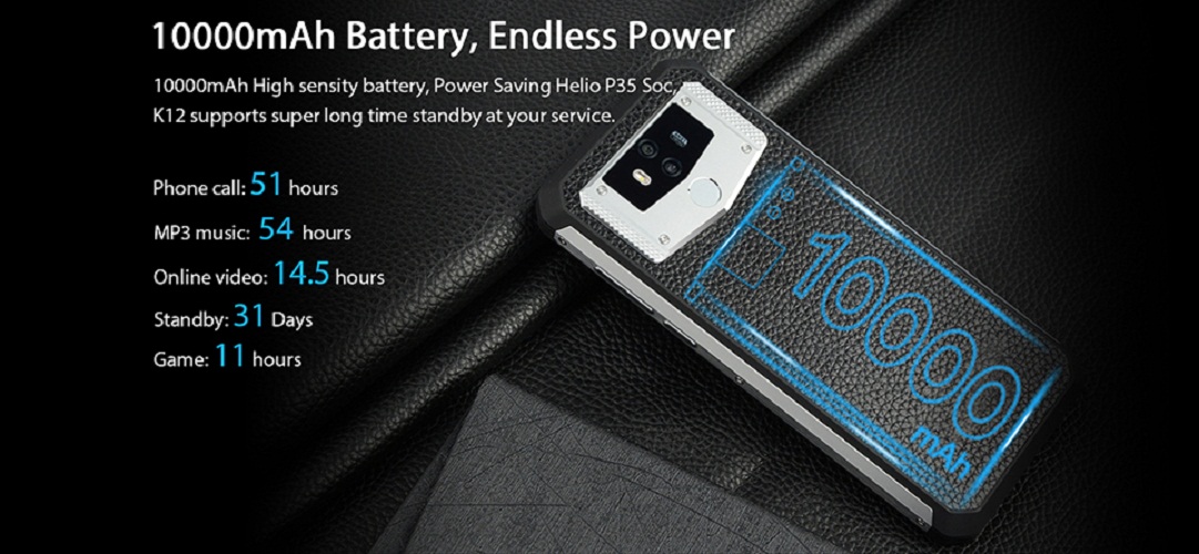 Với pin 10000mAh và OTG được hỗ trợ, K12 có thể hoạt động như một ngân hàng năng lượng để sạc lại cho bất kỳ thiết bị thông minh nào khác.