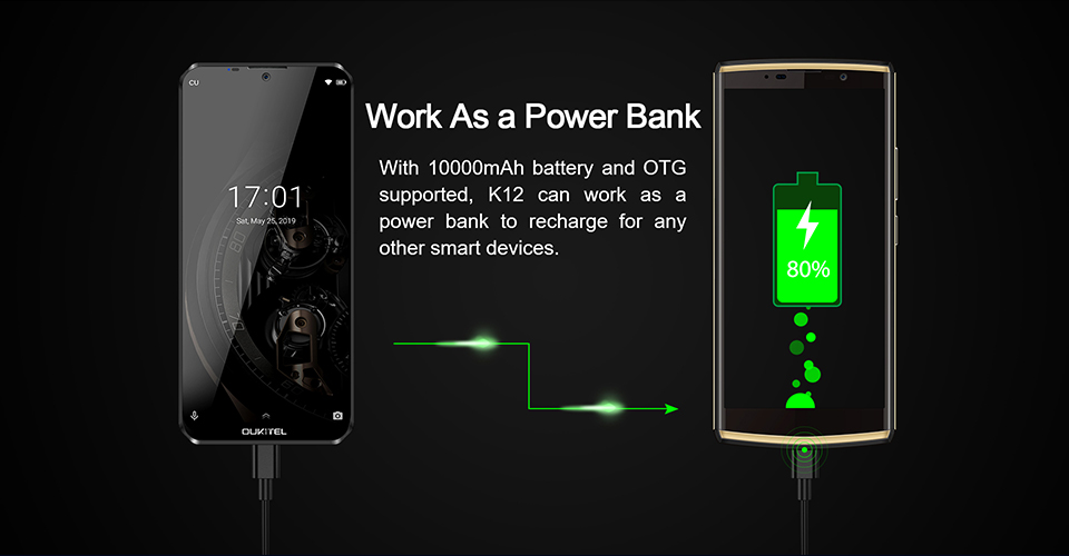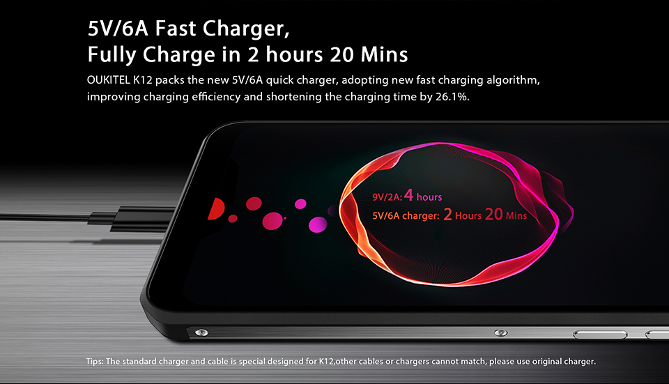 Với OUKITEL K12 bộ sạc nhanh SV / 6A mới, áp dụng cải thiện hiệu quả sạc và rút ngắn 26,1% .