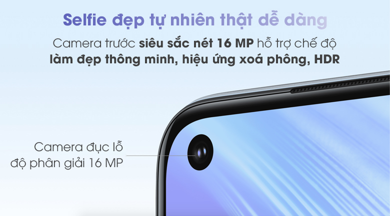 Camera trước có độ phân giải cao 16 MP cùng chế độ làm đẹp AI, hiệu ứng xóa phông, cho ra những bức ảnh selfie tự nhiên, giúp bạn tự tin chia sẻ ngay mà không cần chỉnh sửa thêm.