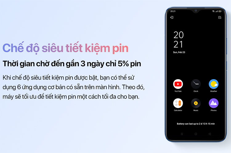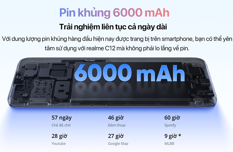Để phục vụ nhu cầu gaming ngày dài, Realme C12 được trang bị viên pin dung lượng tận 6000mAh. Với mức dung lượng này, bạn sẽ yên tâm sử dụng điện thoại chơi game hoặc xem phim lướt web thỏa thích mà không phải lo lắng về pin. Bên cạnh đó, chiếc điện thoại còn trang bị chế độ siêu tiết kiệm pin. Khi chế độ này được bật, bạn có thể sử dụng 6 ứng dụng cơ bản có sẵn trên màn hình. Theo đó, máy sẽ tối ưu để tiết kiệm pin một cách tối đa cho bạn. Thời gian chờ đến gần 3 ngày nhưng chỉ hao tốn 5% pin.