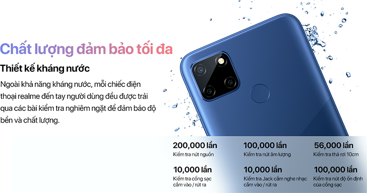 Điện Thoại Realme C12 có thiết kế đẹp mắt với vỏ nhôm nguyên khối. Các góc bo cong mềm mại cùng viền mỏng mang đến cho chiếc điện thoại nét thanh lịch và hiện đại. Bên cạnh đó, Realme C12 còn có khả năng kháng nước. Mỗi chiếc điện thoại Realme đến tay người dùng đều được trải qua các bài kiểm tra nghiêm ngặt để đảm bảo độ bền và chất lượng.