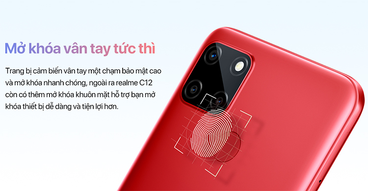 Mặt sau máy được trang bị cảm biến vân tay một chạm bảo mật cao và giúp bạn mở khóa nhanh chóng. Ngoài ra, Realme C12 còn có thêm mở khóa khuôn mặt hỗ trợ bạn mở khóa thiết bị dễ dàng và tiện lợi.