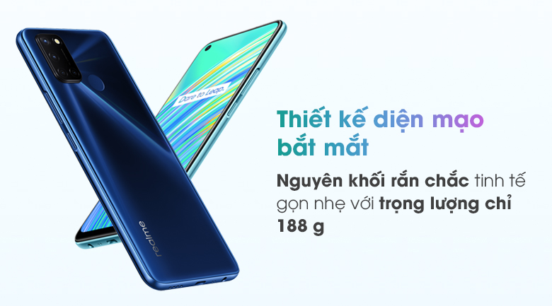 Chạy theo xu thế thiết kế nguyên khối rắn chắc, Điện Thoại Realme C17 không kém phần tinh tế và gọn nhẹ với trọng lượng chỉ 188 g. Bao gồm 2 bản màu chính: Lake Green và Navy Blue tươi sáng, thanh lịch.