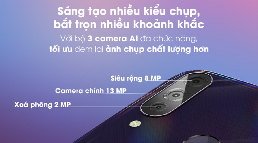 Ấn tượng nhất là camera chính 13 MP với khả năng chụp ảnh sắc nét trong điều kiện đủ ánh sáng. Kể cả trong điều kiện thiếu ánh sáng thì camera này vẫn mang đến những bức ảnh đầy tính nghệ thuật nhờ công nghệ nhận diện AI. Bên cạnh đó, máy còn có camera góc siêu rộng 8 MP. Nó có góc chụp lên tới 120 độ, rộng gấp đôi so với camera thông thường.Cuối cùng là camera mono với độ phân giải 2 MP.