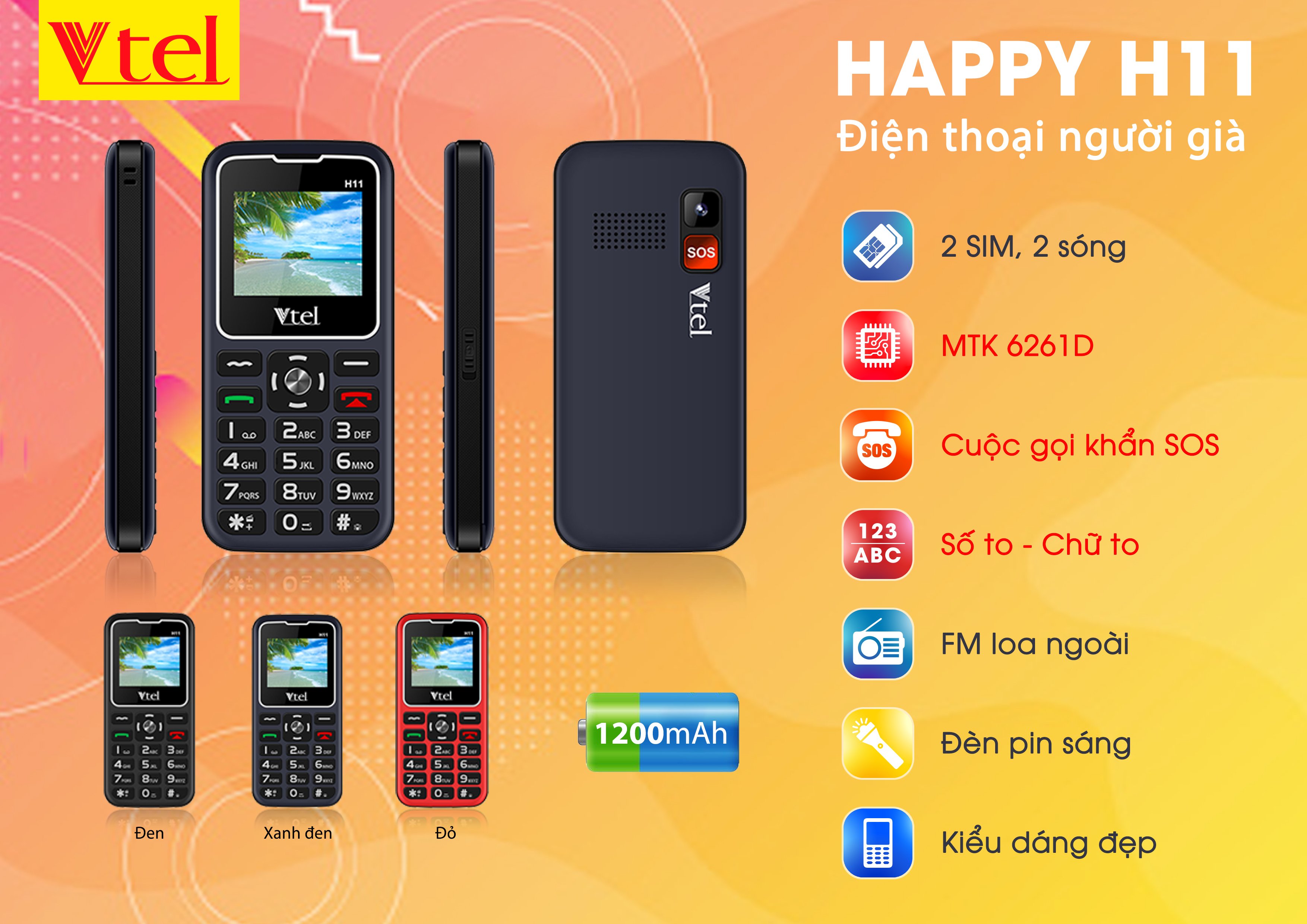 Điện thoại Vtel Happy H11 (Điện thoại cho người già - 2 Sim) - Gọi SOS khẩn, Số To, Chữ To, Loa to, FM loa ngoài, Pin lớn, Thiết Kế Đẹp - Hàng Chính Hãng