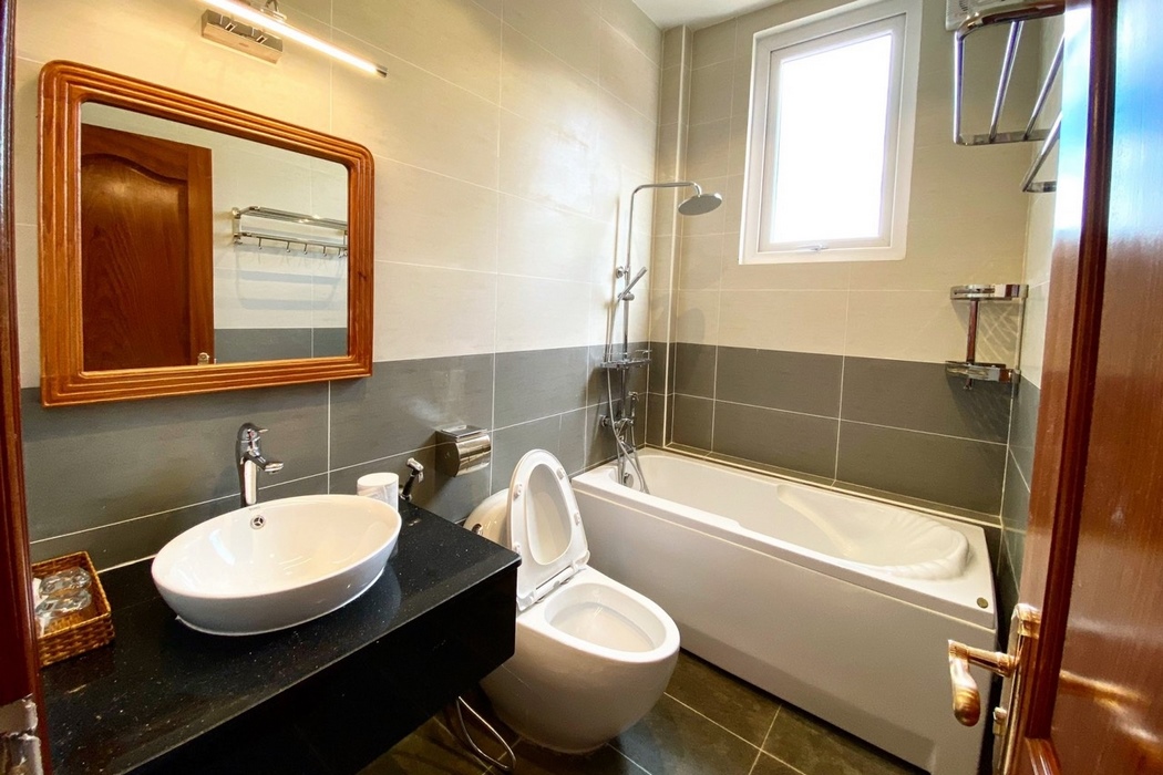 Phòng tắm tại Don Villa Hồ Xuân Hương cũng rất đầy đủ tiện nghi. Nơi đây có hẳn bồn tắm cho những gia đình muốn ngâm mình thư giãn trong không khí Đà Lạt.