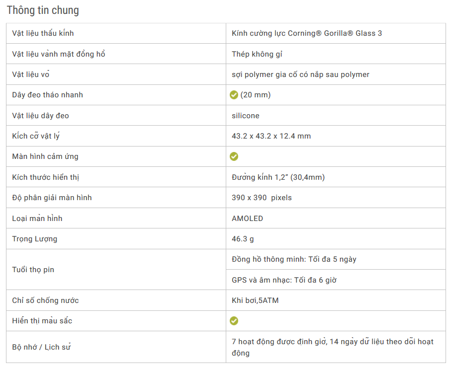 Màn hình AMOLED sắc sảo với tuổi thọ pin lên đến 5 ngày ở chế độ đồng hồ thông mình; lên đến 6 giờ ở chế độ GPS và âm nhạc