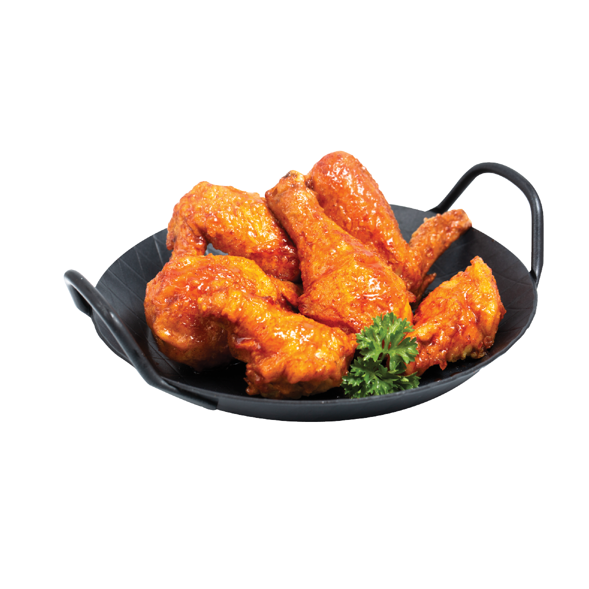 Phần ăn dành cho 1 người, bao gồm 6 miếng gà ( 2 đùi, 2 cánh cắt đôi) được phủ xốt cay/ mật ong/ tỏi ( tùy chọn) dùng kèm với kim chiLogo: Hình ảnh một người đàn ông năng động, hiện đại vào bếp với trạng thái vui vẻ và yêu đời.
