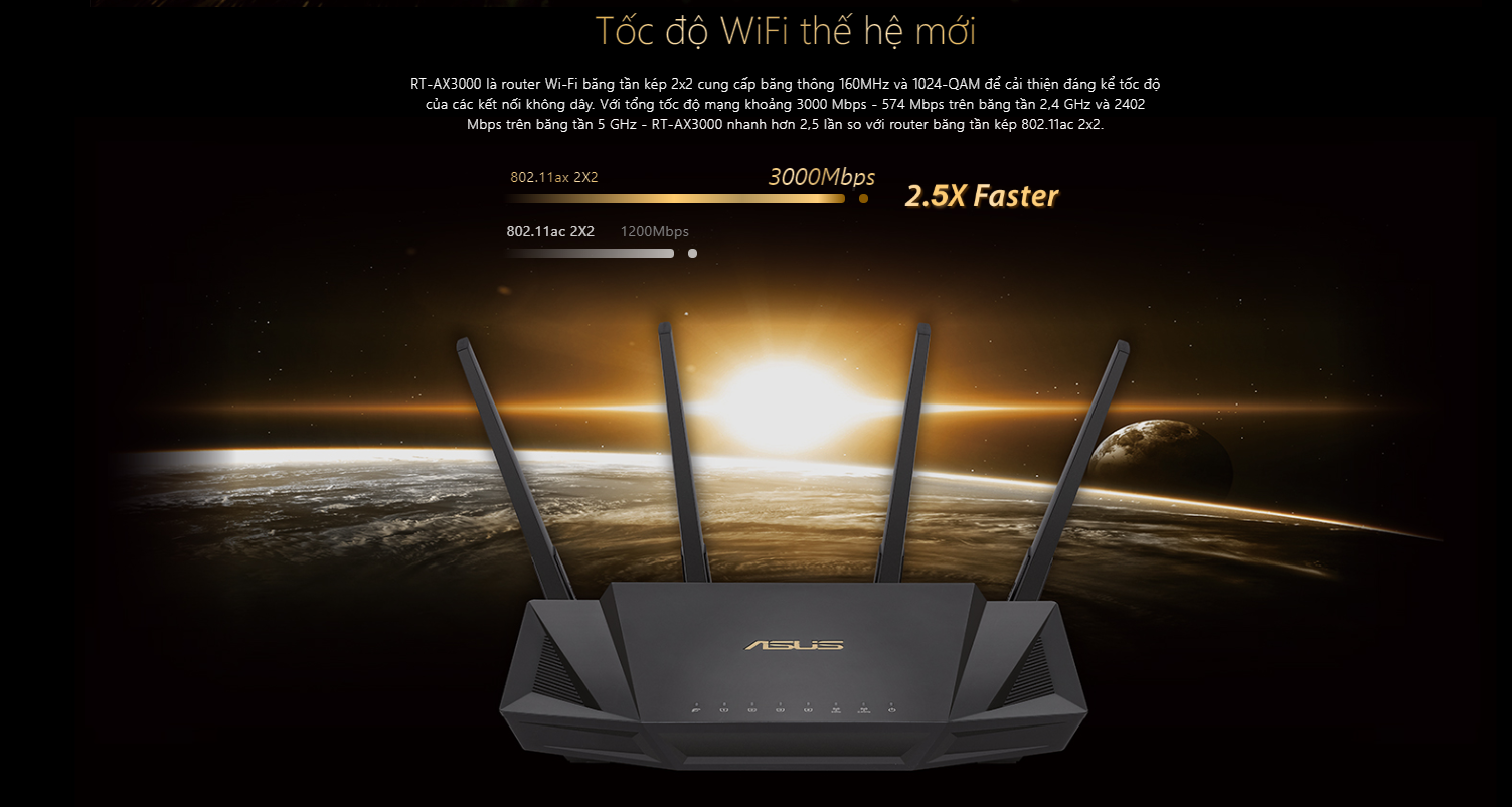 Router RT-AX3000 Dual Band WiFi 6 (802.11ax) hỗ trợ công nghệ MU-MIMO và OFDMA, với bảo mật mạng AiProtection Pro do Trend Micro cung cấp, tương thích với hệ thống ASUS AiMesh WiFi