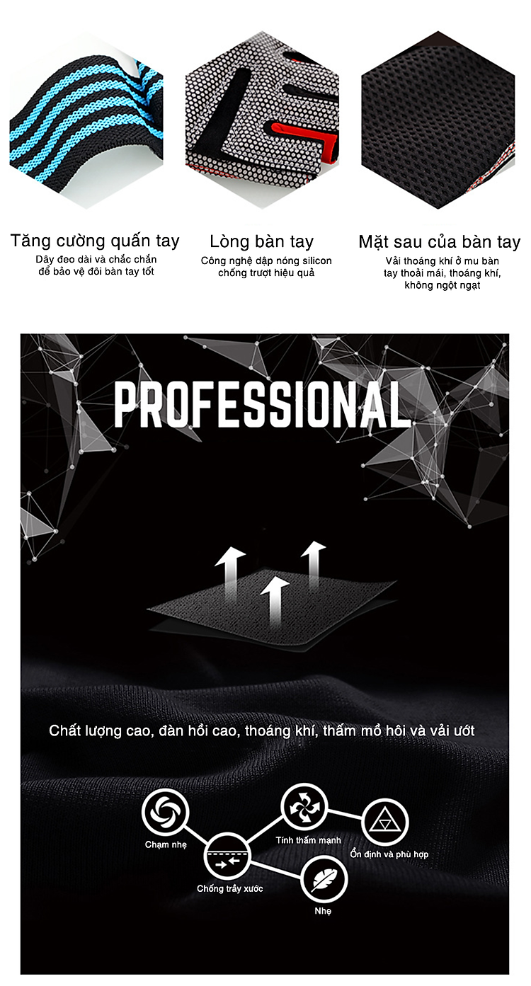 - Giữa lòng bàn tay sử dụng bằng chất liệu silicon chống trơn trượt trong lúc chơi thể thao.