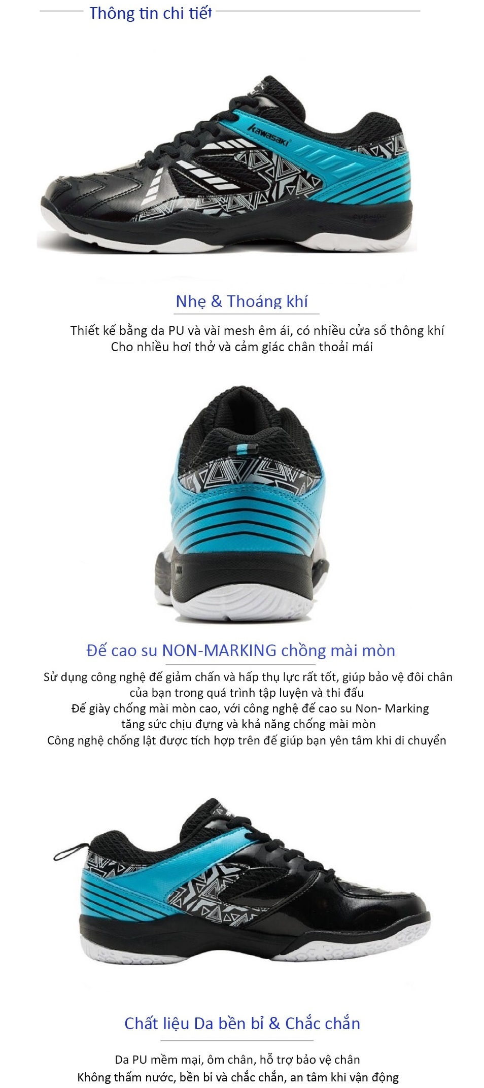 • Giày cầu lông Kawasaki được thiết kế đặc biệt với các thành phần như PU leather, Eva, Rubber giúp đôi giày bền và mềm hơn so với các thương hiệu cầu lông khác.