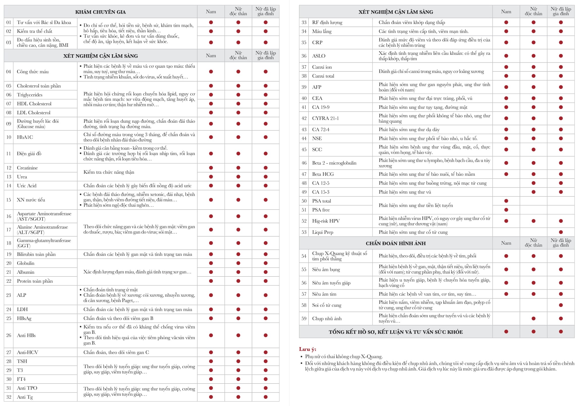 Nội dung gói khám: Nội dung gói khám được thiết kế khoa học với các chỉ định từ cơ bản đến chuyên sâu (có 50 xét nghiệm cận lâm sàng trong đó có đến 15 xét nghiệm phát hiện sớm ung thư, kết hợp với các chỉ định chẩn đoán hình ảnh khác) giúp đánh giá sức khỏe của khách hàng 1 cách toàn diện nhất. Chi tiết như sau:
