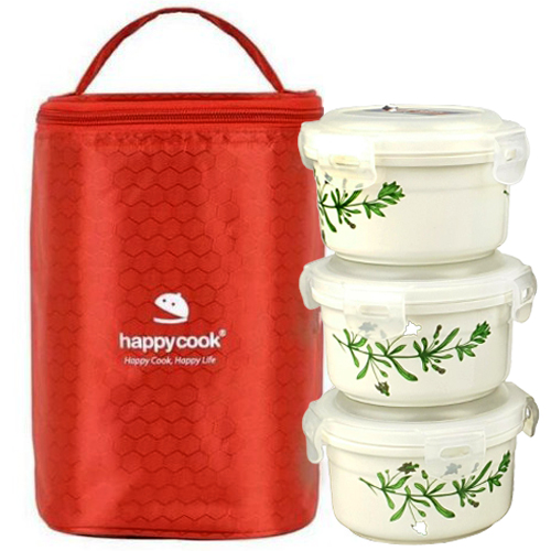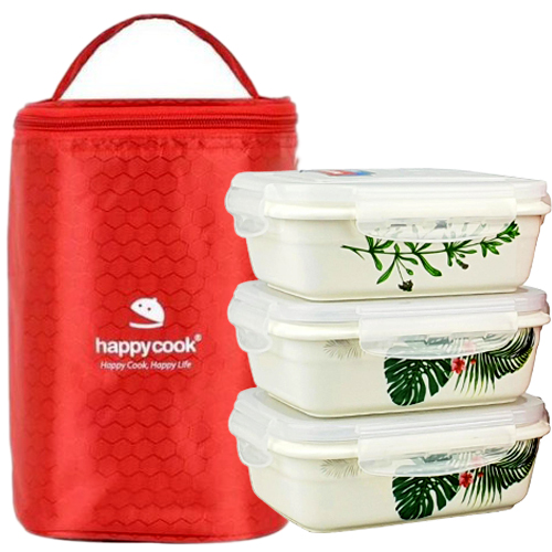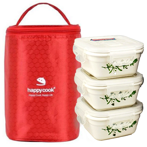 Hộp Đựng Cơm Cà Men Giữ Nhiệt 3 Tầng Happy Cook Chất Liệu Gốm Sứ Chịu Nhiệt 1400 Độ C Tặng Túi Đựng Giữ Nhiệt Cao Cấp -Hàng Chính Hãng