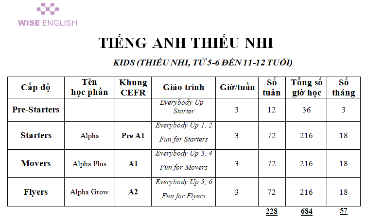 - Quy chuẩn đầu ra: Giúp các bạn đạt được những chứng chỉ Anh ngữ quốc tế như Chứng chỉ Movers và Flyers thuộc hệ thống chứng chỉ YLE (Young Learners English Test), chứng chỉ A1, A2/A2+, B1-/B1, KET và PET.