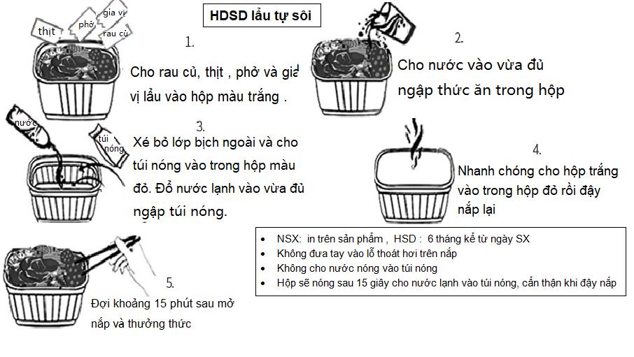 | Lẩu tự sôi hay còn gọi là lẩu ăn liền không cần nấu nước sôi . Từ xưa đến nay, cứ mỗi lần nhắc đến Trùng Khánh thì người ta không thể không nhắc đến Lẩu Trùng Khánh . Được ví như Kinh Đô lẩu của thế giới. Mang hương vị đặc trưng cay cay của ớt , vị tê tê nóng nóng của hoa tiêu cũng như các nguyên liệu đã qua tuyển chọn khác, lẩu Trùng Khánh hứa hẹn mang đến cho bạn những trải nghiệm hương vị chưa từng có trước đây , trở thành lựa chọn hàng đầu của người dân địa phương cũng như nhiều du khách khi đến Trùng Khánh Nắm bắt được xu thế này, các nhà sản xuất thực phẩm đóng hộp đã không ngừng nghiên cứu và cho ra đời sản phẩm lẩu tự sôi . Sản phẩm được xuất đi nhiều nước nhằm phục vụ cho hàng triệu thực khách trên thế giới . Lẩu tự sôi, hay còn gọi là lẩu ăn liền . Thực khách không cần phải đun hay nấu nước , Đi kèm với hộp lẩu đều có 1 túi nóng . Chỉ cần cho nước lạnh vào túi nóng, sau 15 phút hộp lẩu sẽ tự sôi và có thể thưởng thức ngay . Sản phẩm đã được cục ATVSTP cấp chứng nhận đạt tiêu chuẩn an toàn vệ sinh thực phẩm . Hướng dẫn sủ dụng : Lần lượt cho theo thứ tự : phở , rau củ ,thịt, gia vị vào hộp trên ( màu trắng ) . Sau đó cho túi nóng vào hộp dưới ( màu đỏ) , đổ nước nguội vào hộp dưới sao cho vừa đủ ngập túi nóng (lưu ý : lượng nước cho vào túi nóng nếu ít quá hoặc nhiều quá cũng sẽ ảnh hưởng đến tác dụng làm nóng của túi, vì thế chỉ nên cho vừa đủ ) . Nhanh chóng chồng hộp màu trắng lên hộp đỏ, cho nước lạnh vào vừa đủ ngập thức ăn trong hộp . Đậy nắp và đợi 15 phút sau để thưởng thức . Hạn sử dụng : 6 tháng kể từ ngày sản xuất |