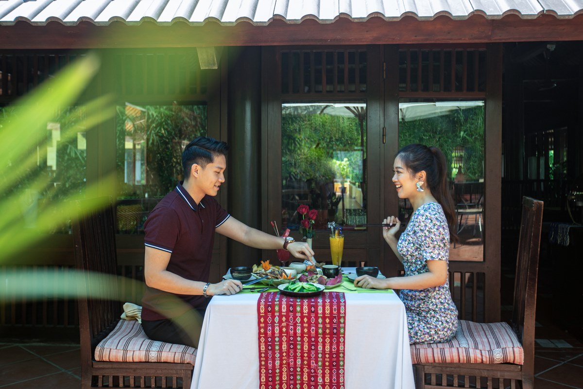 Đến với nhà hàng Bó Luông được xây dựng từ gỗ căm xe quý hiếm, quý khách sẽ được phục vụ những món ăn đặc biệt tại Mai Châu cũng như ẩm thực quốc tế và các thức uống đa dạng. Quý khách còn có thể thưởng thức một bữa ăn lãng mạn trong ánh nến tại ban công trong phòng nghỉ hoặc cỗ xe ngựa bên hồ.