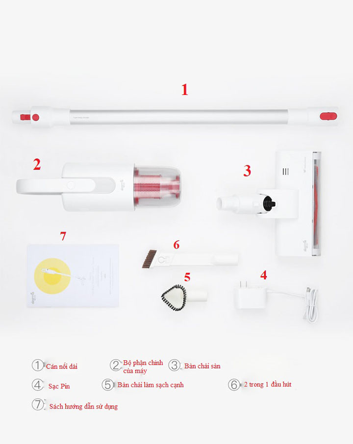 Bộ sp gồm : cán nối dài, máy, bàn chải sàn, 2 trong 1 đầu hút, bàn chải làm sạch cạnh, sạc pin, sách hướng dẫn