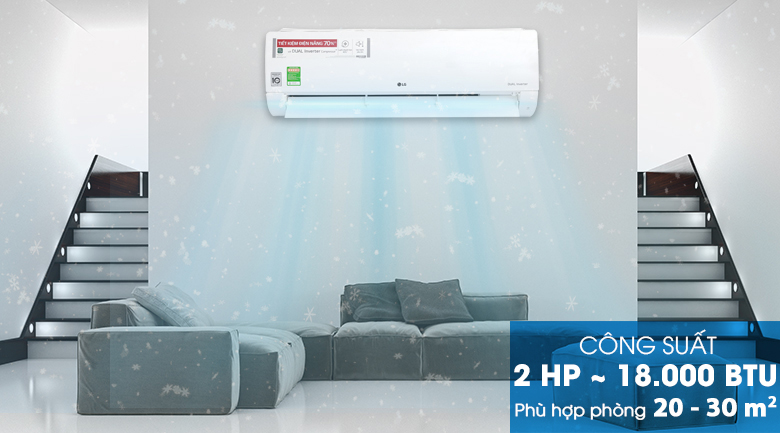 Máy lạnh Inverter LG được hoạt động mạnh mẽ với công suất làm lạnh 2.0HP rất phù hợp với không gian phòng khách, phòng làm việc, phòng ngủ lớn và vừa có diện tích từ 20 - 30 m2.