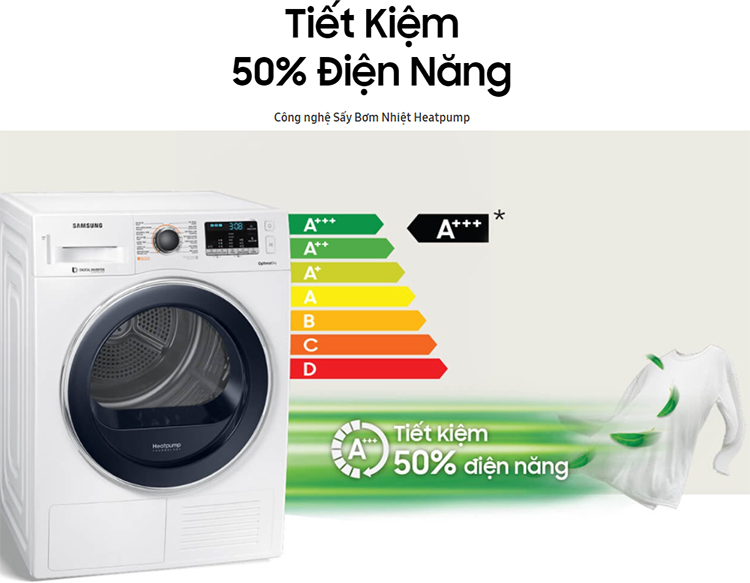 Công nghệ Heatpump trên máy sấy Samsung sử dụng chất làm lạnh thay cho điện năng, nhanh chóng làm nóng luồng không khí, giúp bạn sấy khô từng sợi vải và tiết kiệm 50% điện năng tiêu thụ so với các dòng máy thông thường khác.
