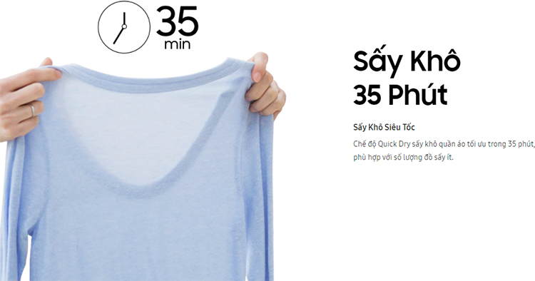 Với tính năng sấy khô Quick Dry, giờ đây bạn có thể nhanh chóng sấy khô quần áo chỉ trong 35 phút. Mang đến cho gia đình bạn những bộ áo quần khô ráo sau khi sấy xong là mặc liền mà không cần phải phơi ngoài trời.