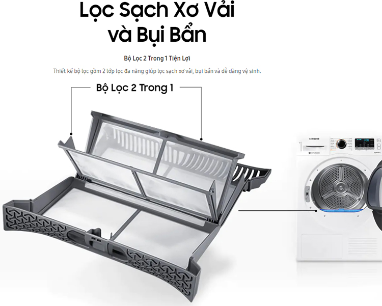 Với thiết kế bộ lọc 2 trong 1 gồm hai lớp lưới lọc đa năng, máy sấy Samsung gia tăng hiệu năng vận hành và duy trì khả năng sấy khô mạnh mẽ mà không cần đến màn lọc trao đổi nhiệt. Với màng lọc này, máy có thế bảo vệ chúng ta tránh được những loại bụi bẩn độc hại như lông thú, bụi vài trong quần áo, rất nhỏ tưởng chừng như không ảnh hưởng đến cuộc sống nhưng thật ra chúng lại không tốt cho sức khỏe nếu hít phải trong thời gian dài.