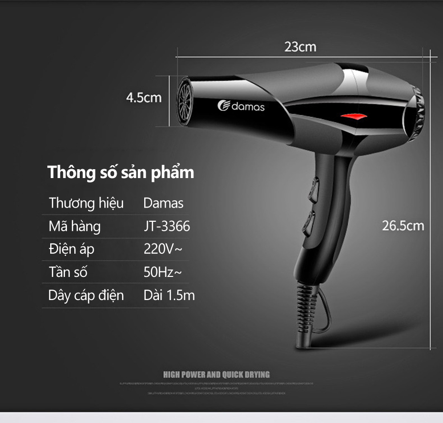 - Máy sấy tóc DAMAS JT-3366 tạo ra luồng khí và công suất sấy tối ưu, mang lại mái tóc đẹp hàng ngày.