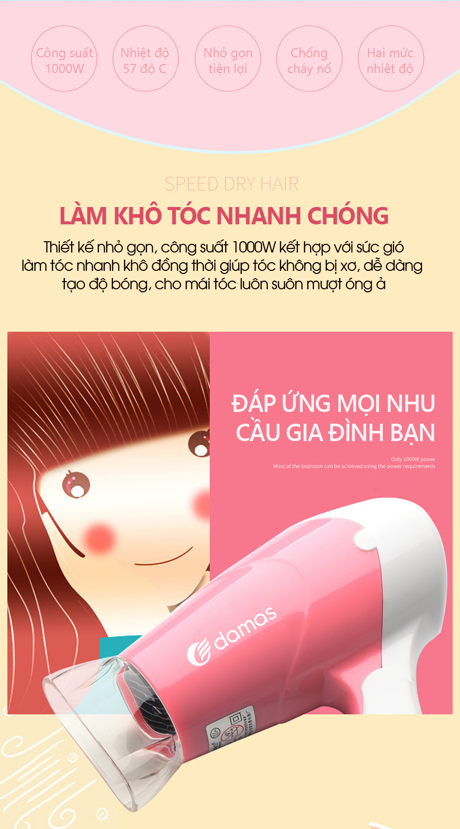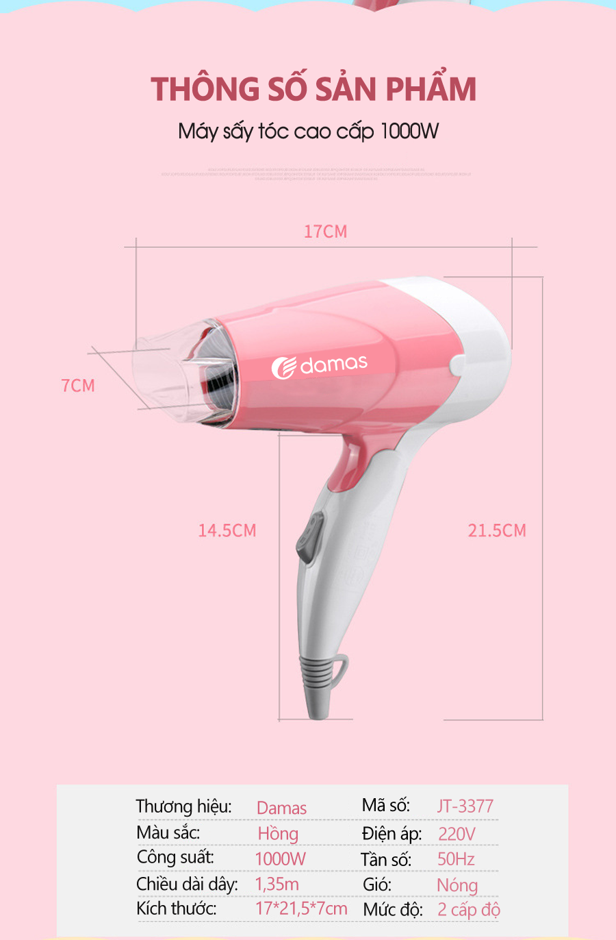 - Máy sấy tóc DAMAS JT-3377 tạo ra luồng khí và công suất sấy tối ưu, mang lại mái tóc đẹp hàng ngày.