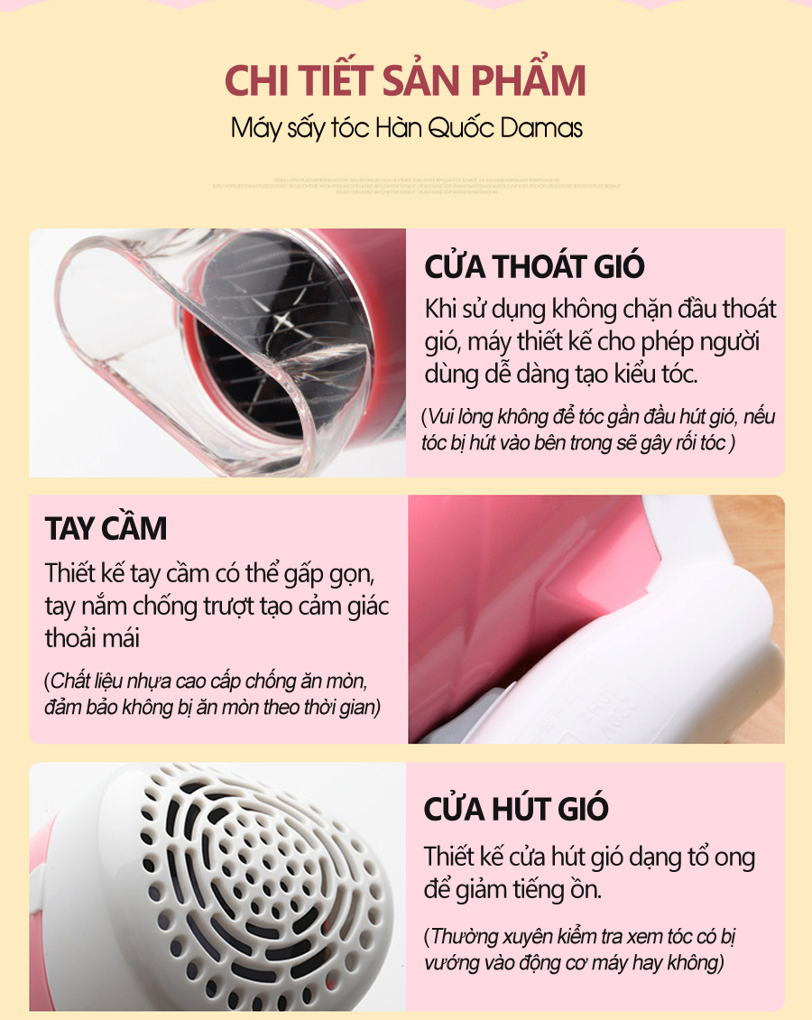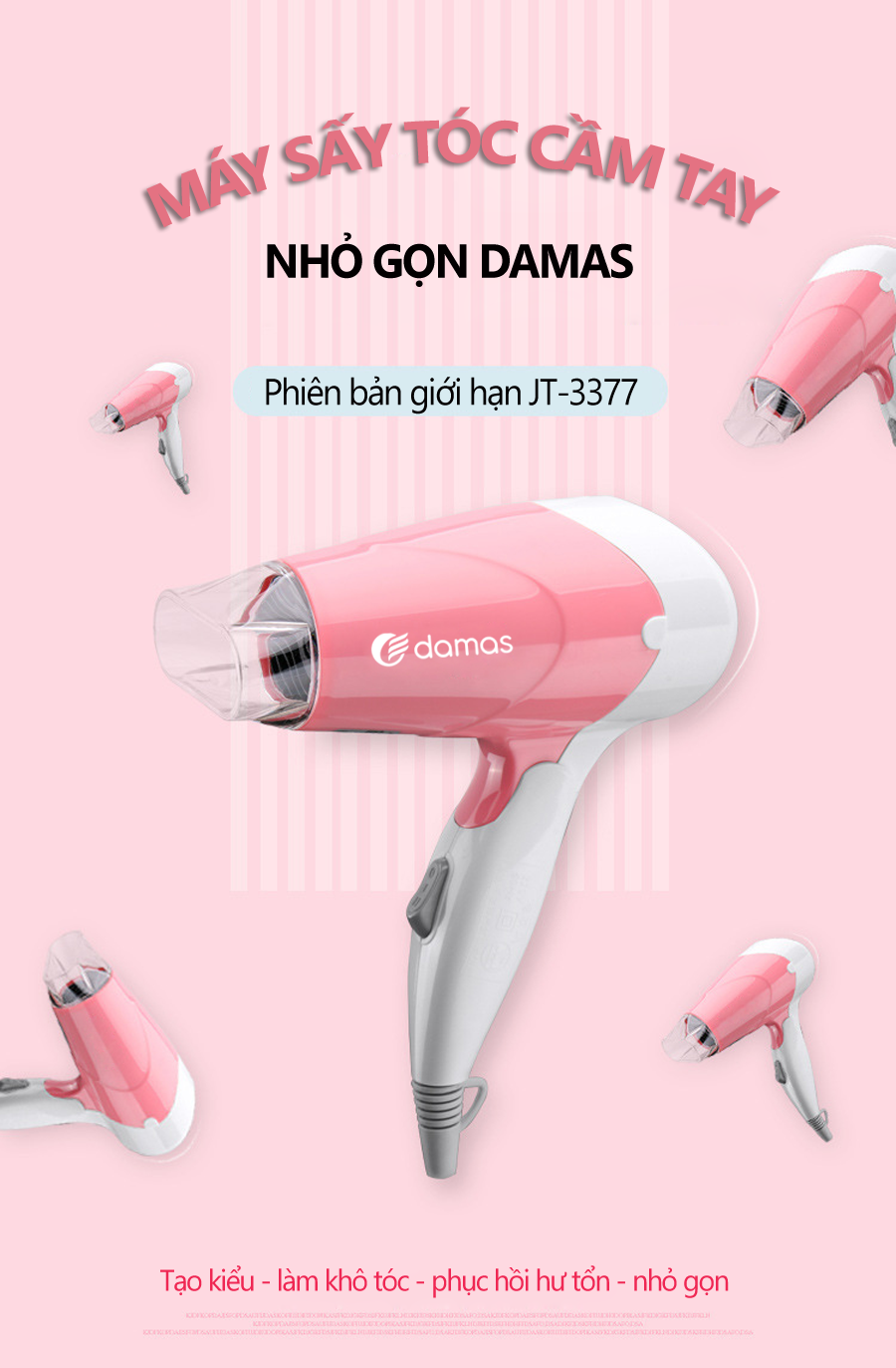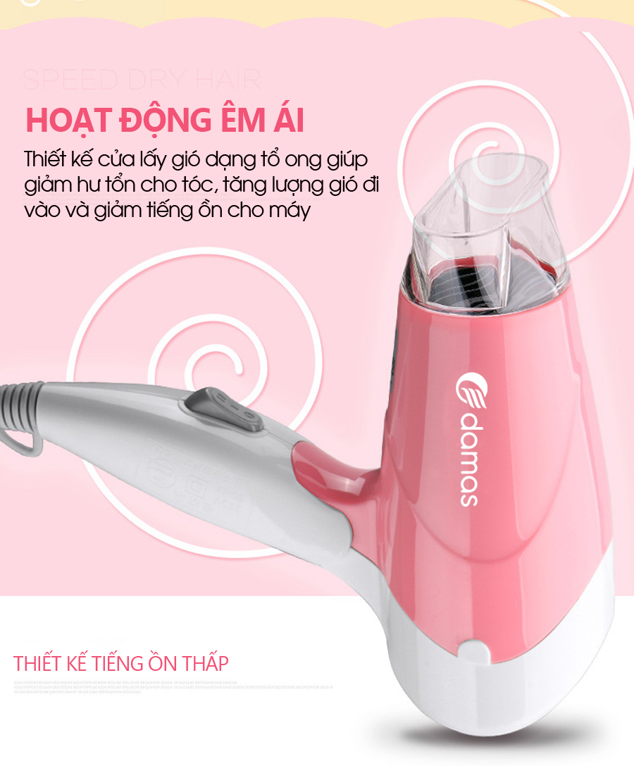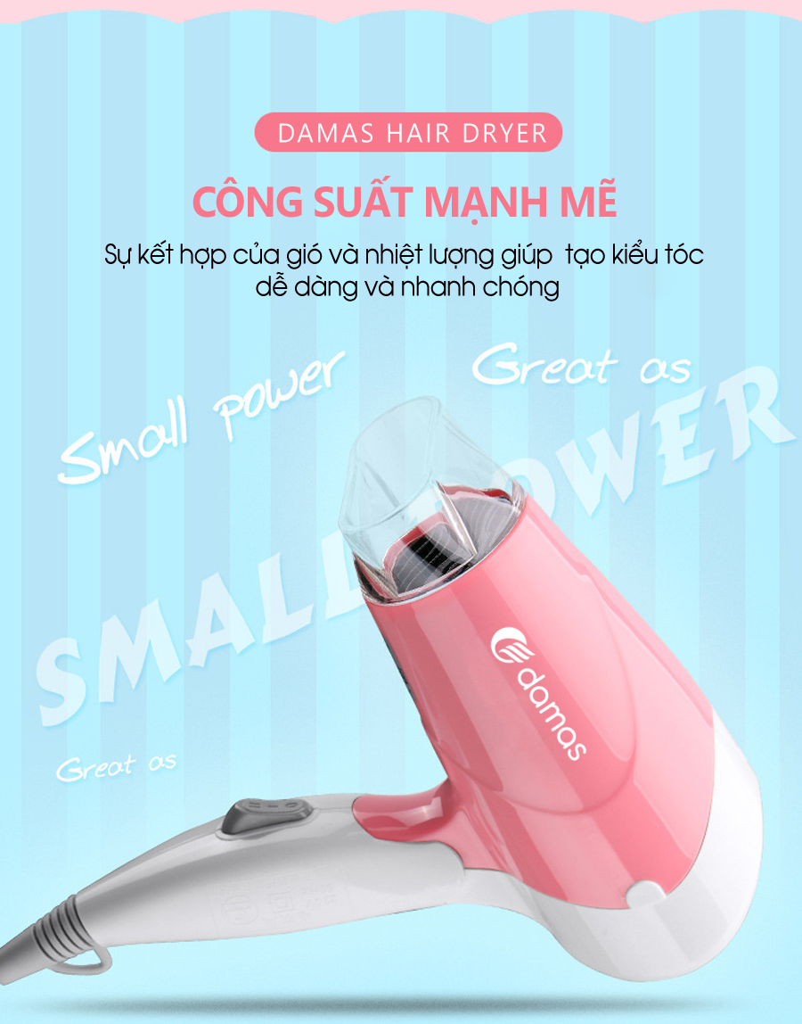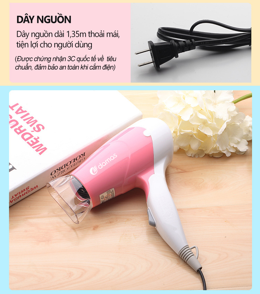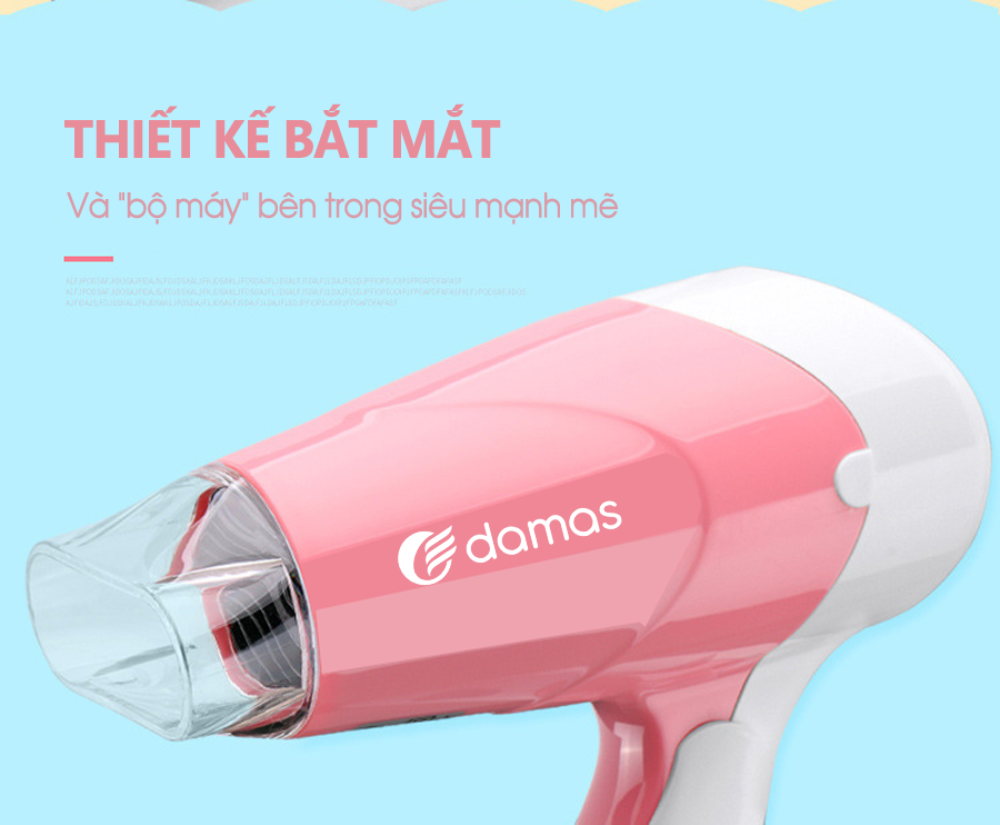 Máy Sấy Tóc Mini Damas JT3377 (Chính Hãng) - Tay cầm gấp gọn tiện dụng, chế độ bảo vệ nguồn điện, tự động ngắt nguồn chống cháy thiết bị
