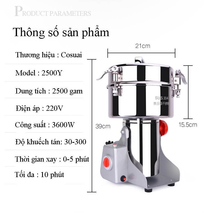 Máy xay, nghiền đồ khô, bột, ngũ cốc COSUAI chất liệu INOX 304 cỡ siêu lớn 2.500 gam, công suất 3.600W (xay được khối lượng rất lớn)- hàng nhập khẩu