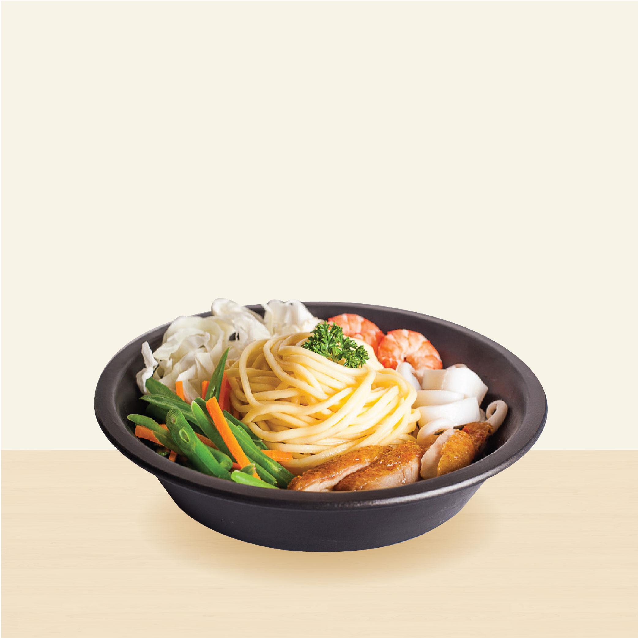 Phần ăn dành cho 1 người, bao gồm mì tươi, các loại rau củ, tôm, mực và gà cắt phi lê dùng kèm với các loại xốt trên menu