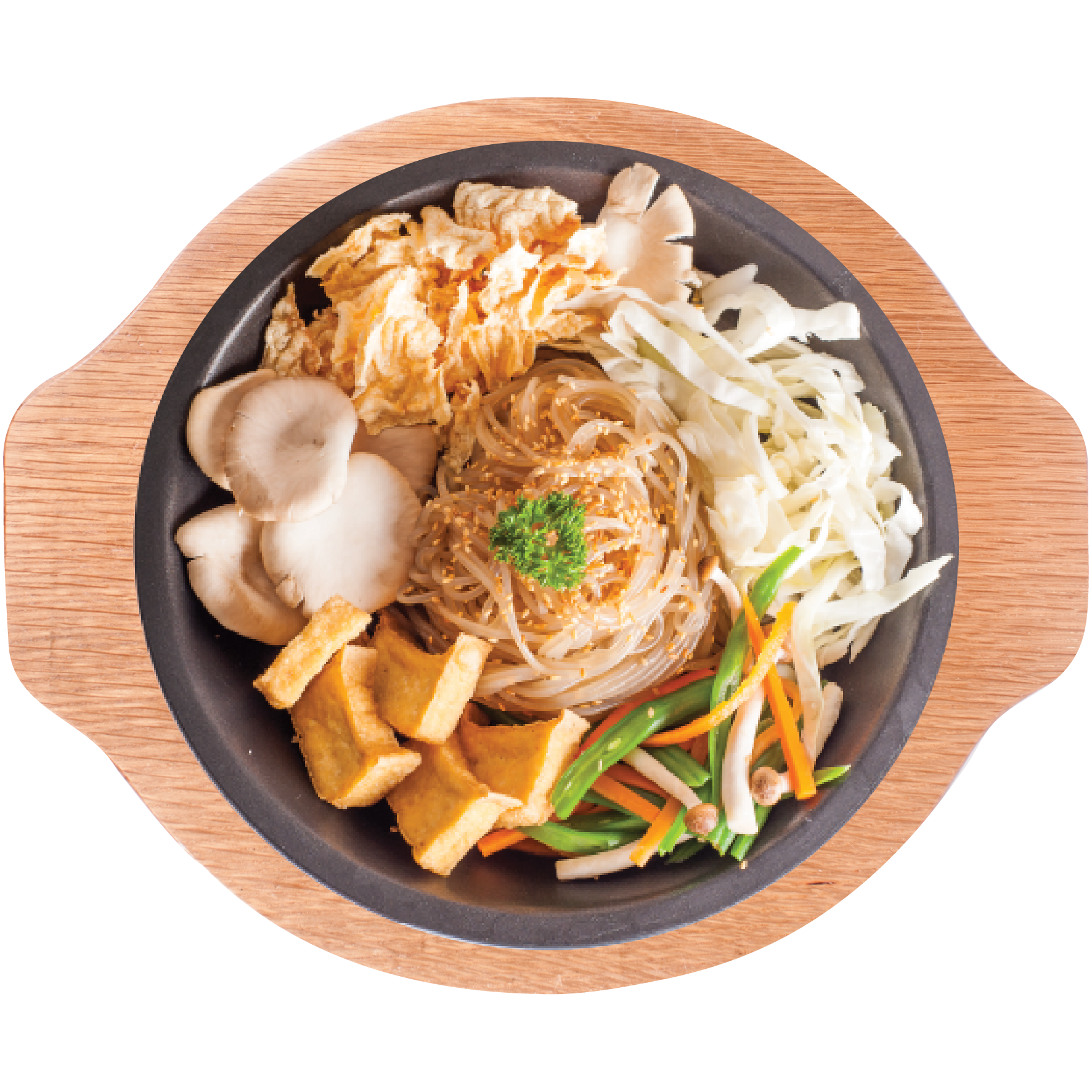 Phần ăn dành cho 1 người, bao gồm miến Hàn Quốc, các loại rau củ, và nấm bào ngư được dùng kèm với xốt chayLogo: Hình ảnh một người đàn ông năng động, hiện đại vào bếp với trạng thái vui vẻ và yêu đời.