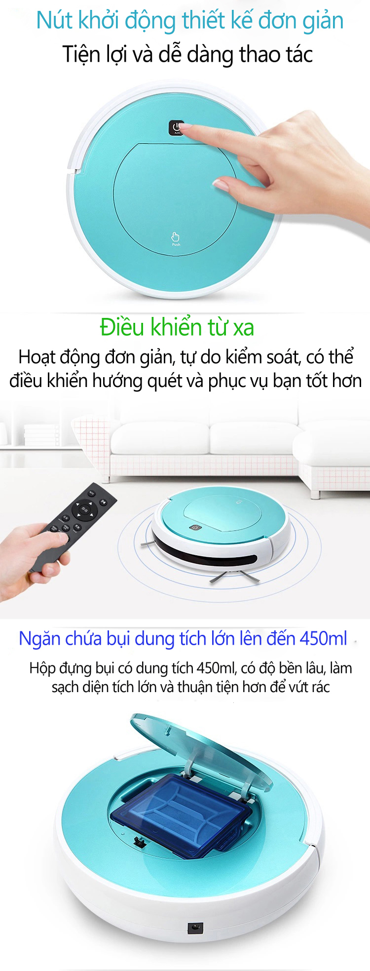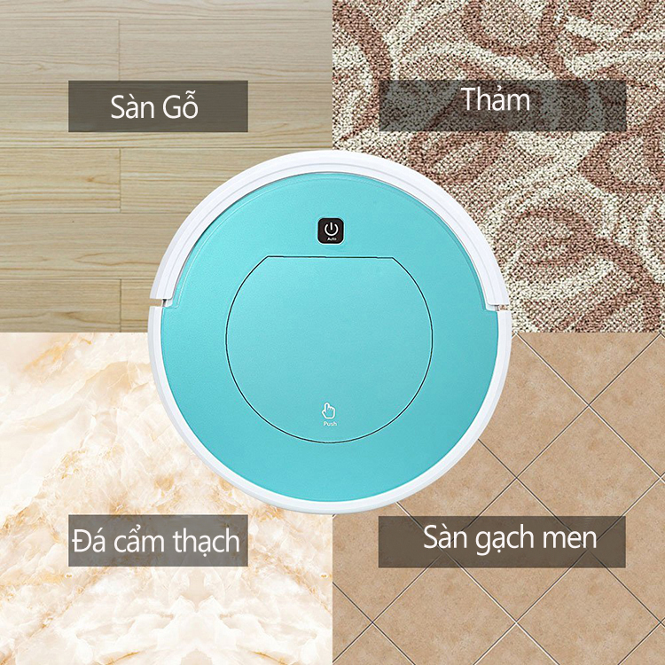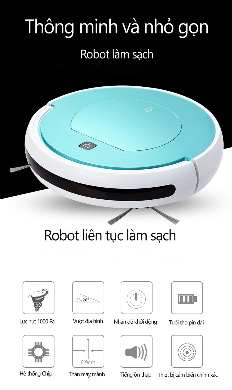 MÁY Hút Mạnh - Lau SạchTự động di chuyển và vệ sinh sàn nhà. máy Tự Động đổi hướng khi đáp ứng tường và chướng ngại vật.Di chuyển linh hoạt, chức năng chống rơi máy Đa năng lái xe, càn quét sàn nhà Có sức hút cực khỏe 1800 Pa, ở dưới đáy của máy hút có 2 chổi quét hình tròn để quét bụi và Miếng và 1 miếng lau nhà, Pin Robot có dung lượng 1200 mAh, cực khỏe, làm việc liên tục đến 100 phút .