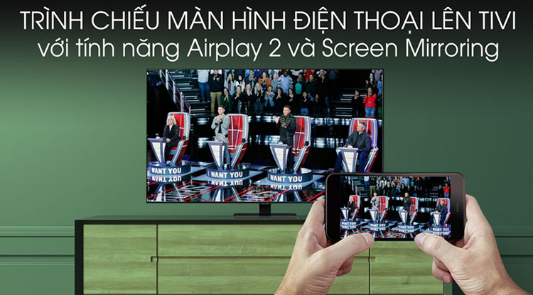 Trình chiếu màn hình điện thoại lên tivi nhờ các tính năng Airplay 2 (thiết bị Apple) và Screen Mirroring (điện thoại Android).