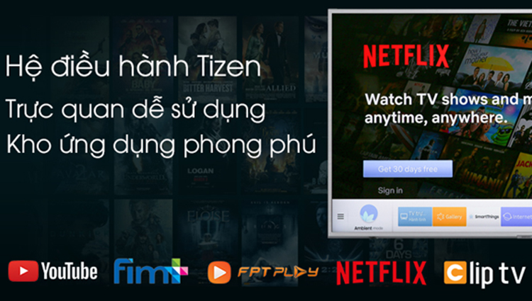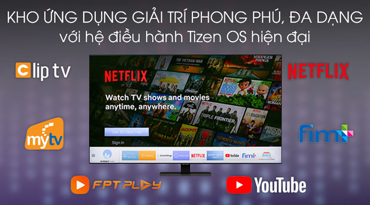 Hệ điều hành Tizen OS trên tivi Samsung 4K với giao diện đơn giản, dễ sử dụng tích hợp sẵn các ứng dụng như: YouTube, Trình duyệt web và cả kho ứng dụng đa dạng tùy bạn có thể tải về theo sở thích giải trí cá nhân: FPT Play, Netflix, VTV Go, Spotify, ZingTV, Clip TV, Film+,