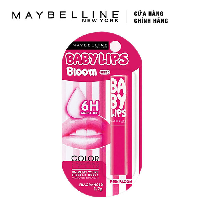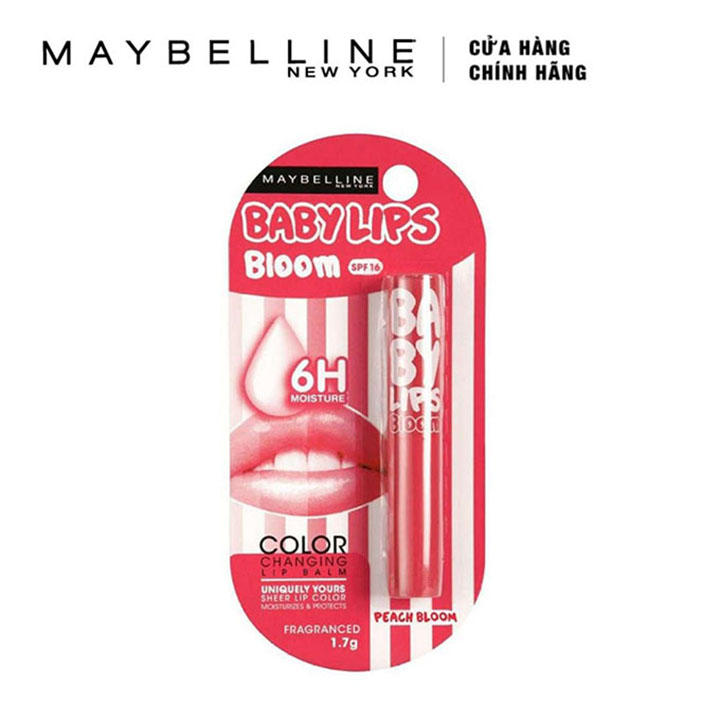 Son dưỡng môi chuyển màu Maybelline New York Bloom Peach sẽ giúp môi bạn vừa mịn màng, vừa lên màu thật tươi trẻ. Thành phần gồm tinh dầu Jojoba, Pro-vitamin giúp dưỡng ẩm cho môi hiệu quả. Chỉ số chống nắng SPF 16 giúp bảo vệ môi tránh khỏi tác hại của tia cực tím. Giờ đây, với MAYBELLINE Bloom, bạn đã có được làn môi căng mọng với sắc màu trẻ trung để đi dạo phố. Có 2 màu: Peach Bloom và Pink Bloom.
