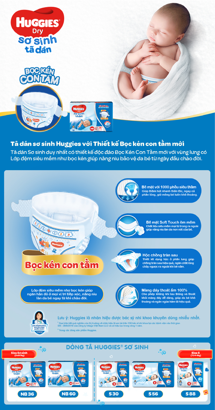 Đây là dòng tã dán sơ sinh duy nhất có thiết kế độc đáo bọc kén con tằm mới với vùng lưng có lớp đệm siêu mềm như bọc kén, giúp nâng niu bảo vệ da bé ngay từ lúc chào đời.