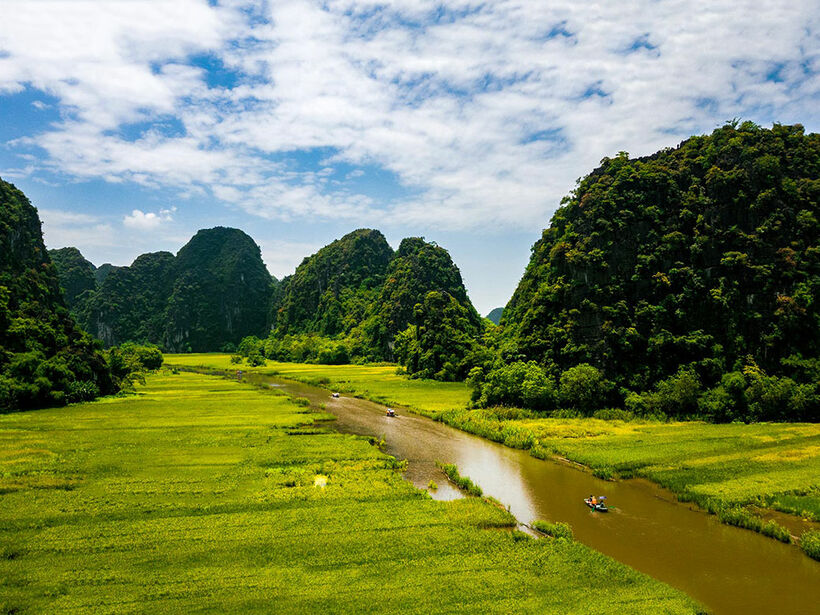 13h30: Quý khách lên thuyền đi thăm quan khu du lịch Tam Cốc nơi được mệnh danh là “Hạ Long trên cạn” bởi những dãy núi đá vôi điệp trùng hiện lên trên mặt nước, xuôi dòng kênh Ngô Đồng lên lỏi qua những ruộng lúa dọc hai bờ để tới với hang hang Cả, hang Hai, hang Ba.