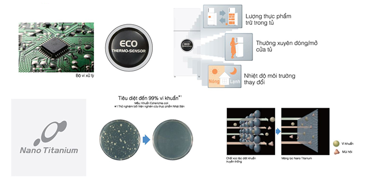 Kết hợp màng lọc Nano Titanium giúp tiêu diệt đến 99% vi khuẩn, công nghệ sử dụng chất xúc tác TiO2, có tác dụng khử mùi và kháng khuẩn mạnh. Tủ lạnh không cần ổn áp, hoạt động ổn định với điện áp 130V-300V.