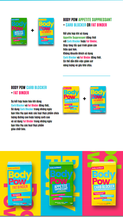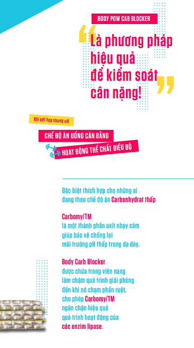 Body Pow Carb Blocker, viên uống giảm béo cho chế độ ăn nhiều thực phẩm như gạo, mì và đường. Viên uống hoạt động bằng cách giảm tác động của calo từ việc ăn và uống thực phẩm có nhiều đường và carbohydrate khác. Carb Blocker có thể giúp bạn giảm cân và duy trì cấu trúc cơ thể săn chắc